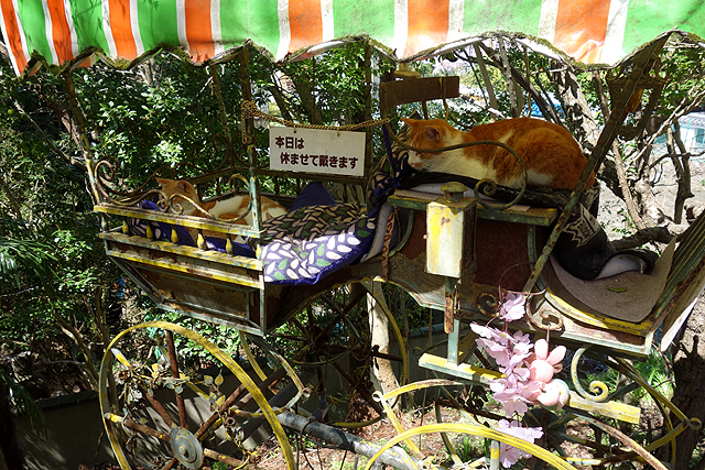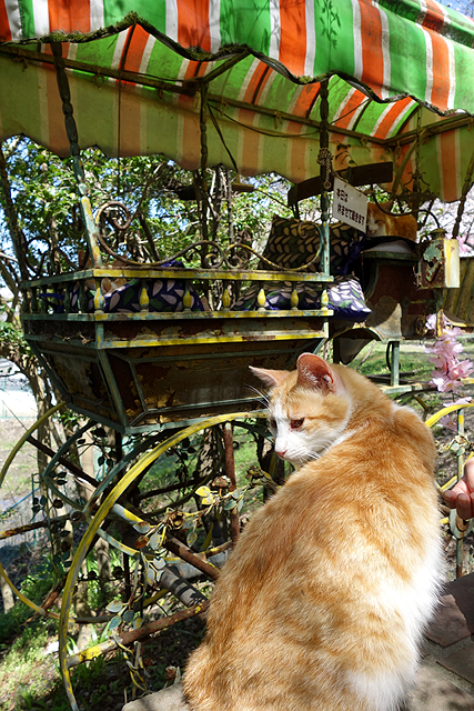 然殷實小民在這花季都放棄觀景、費盡心思賺皮肉勞力錢了,貓兒卻反倒過得愜意。我瞧路旁一撮遊人雜聚,好奇湊去探看,豈料竟是個古典四輪車擱於樹叢。捲繞勾邊的斑鏽顯其早已失修而被丟棄,但卻不知被哪個有心人佈置成造景。只見車架搭起遮棚、擺上軟墊,幾隻貓兒便這麼慵懶趴靠其中。