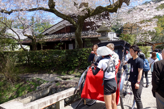 初日夜裡曾於白川遇上人力車,此刻在橋頭又見到了,不過再次打量研究後,不太理解他們穿著是否有所制規。有漢子戴著布質斗笠暗掩眉眼,卻以緊身短打露出精壯大小腿。亦有青年惜肉如金,用黑衣密裹緊實,但將清秀帥臉大方示人,飄逸髮流襯其笑靨。難道是明白各自優勢,以不同心機引攬客人嗎?