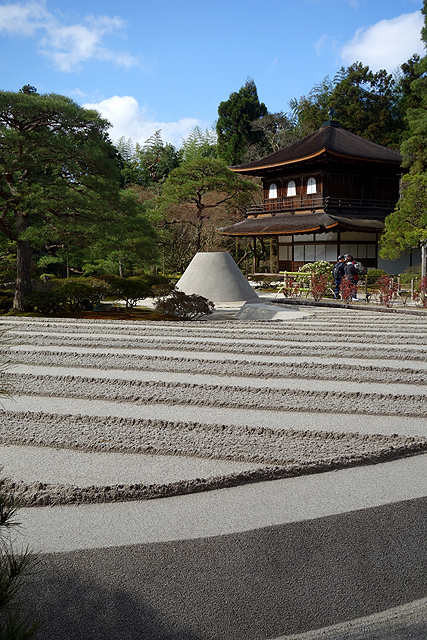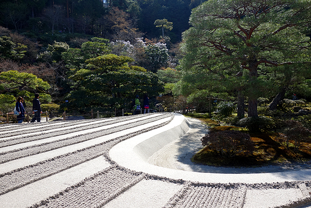 「足利義政」去世後這兒根據其法號成了「慈照寺」,與「金閣寺」同為「臨濟宗相國寺」支派。不過世人似更喜它的另個「銀閣」稱號,彷彿當走訪庭院,便能踏入一片月色之中。也的確,一反「金閣」踞立於開闊靜波湖畔,它則以枯山水襯圍,曲池橋徑邊,被稱為「銀沙灘」的細沙粼粼舖展,彎勾如弦月。這沙灘紋帶橫刷,粗糙與平整相間,一旁還堆聚了沙錐,抹平錐頂成為「向月台」,就真好像是一勾彎岸,串起銀閣在幽夜映著月光,而晚風悠然輕拂,帶出起伏微浪。