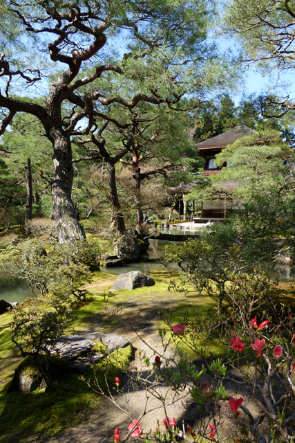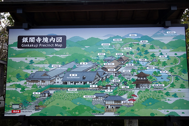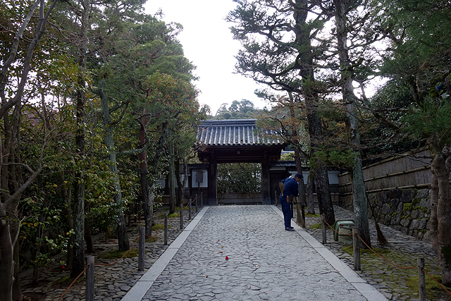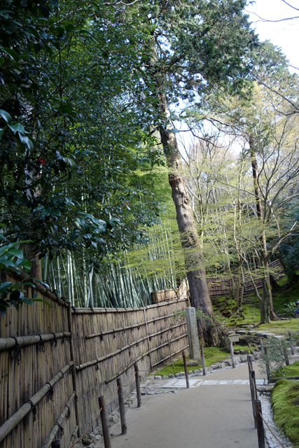 我癡望了許久,才提醒自己得先依著規劃,參訪過「銀閣寺」再來靜心欣賞花影。依著指標往一旁林徑走,寺門方啟,拼石路旁尚有頭髮斑銀的老伯清理樹下殘葉。我穿過總門,沿竹籬搭築的長垣轉行,在購得與「金閣寺」那兒相似的長符般門券後,由中門踏入了寺院。
