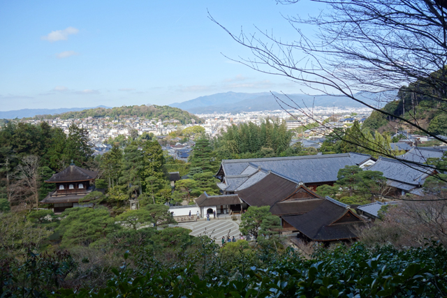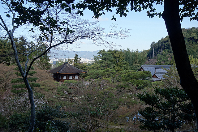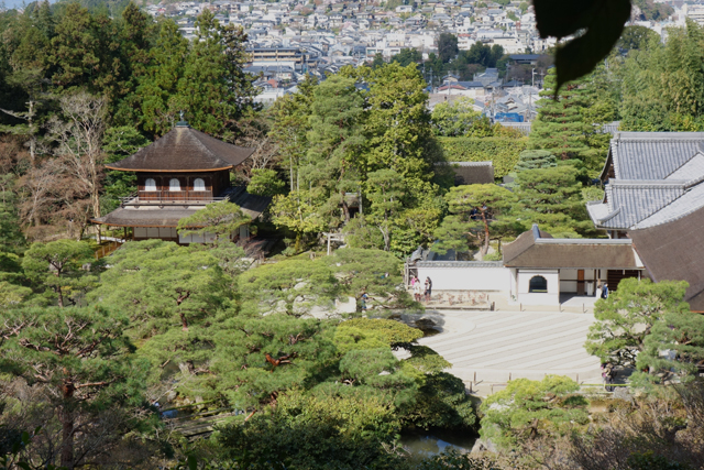 一路登至丘巒開闊處,遠山與京都城宅在天際串織為長帶,繞擁著眼下寺裡屋舍。墨簷切劃,雪沙炫揚,而「銀閣」則低調地隱坐於茂林,深褐木色與葉同生。