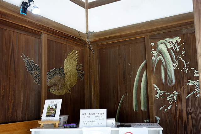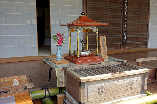於是我只能失望地放棄守候,轉看砌立於沙灘邊的「本堂」。「本堂」門面寬長,廣簷展垂顯得氣派,不過疊掩的窗門令人難見內裡端倪,僅在廊前置了賽錢箱與桌几,於小亭傘下奉著精巧如來指天立地。再往泉瀑飛鳥點畫的轉角窺探,根據立牌似另有著屋內特別拜觀,但猶豫片刻還是作罷了。