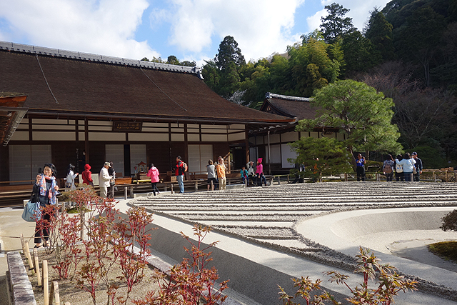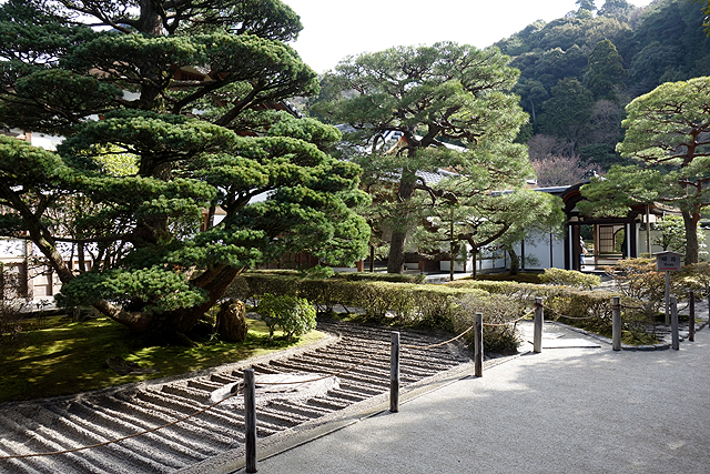 先遇見的是左側的「庫裡」,曾有人提及此類屋室並非易由字面猜度的倉庫,而是毫無關聯的廚房,但網路上又廣見僧侶宿舍及寺務所的說法,莫衷一是。不過眼前隱現的山牆斜簷也真較人難辨端倪,它僅讓錯生的碧松抹畫門面,任銀沙堆列如涓溪紋皺,悠然流轉而過,內裡佈局依舊是個謎。