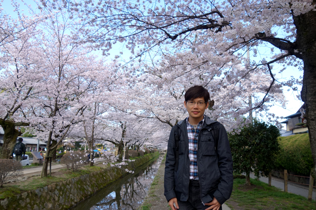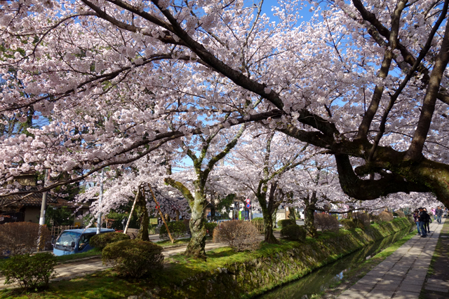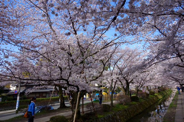 相較於「金閣寺」,今日前往「銀閣寺」的車途略短,加上我清早便行,沒遇上塞車,很快便讓我到達目的地了。不過還尚未看到「銀閣寺」門徑,那沿河漫展的「哲學之道」櫻花就讓人定目,且因趕在人潮擁聚前赴抵,只有些更為狂熱的攝影客持機抬望。這花景清靜幽雅,沒有談聲哄擾,也無人影雜抹,就只是純粹綻放其滿開盛景,讓晨初的微煦柔亮其身瓣。