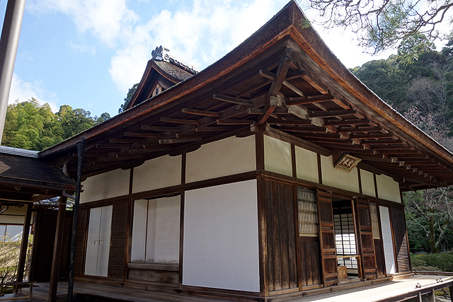 隔鄰是「東求堂」,方整小舍以木色窗門搭襯素牆,趨前能見簷下垂木疊列併展。據說「銀閣」連結著今世因緣,此堂則代表對來生世界的追求。它以「和樣」為基調,格局切分出佛堂與書齋,然沒額外付費的我也無法一探內裝式樣,僅能端看其與池松張揚出的風景,然後循徑往寺後步去。