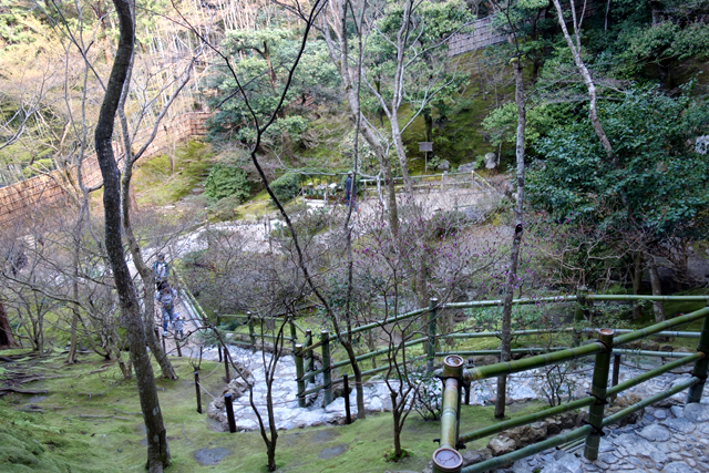 一如「金閣寺」背倚著翠林山丘,此地遊徑也在穿繞了曲池後,往「月待山」攀去。竹籬於丘坡圈出廣地,步徑在略帶枯色的林樹間曲折而上,多數遊人皆於丘底繞池觀閣一圈便離,令行於山道分外閑靜,偶爾還能見幾株彩葉像錯亂了季節的遊楓,趣致點抹著碧坡。