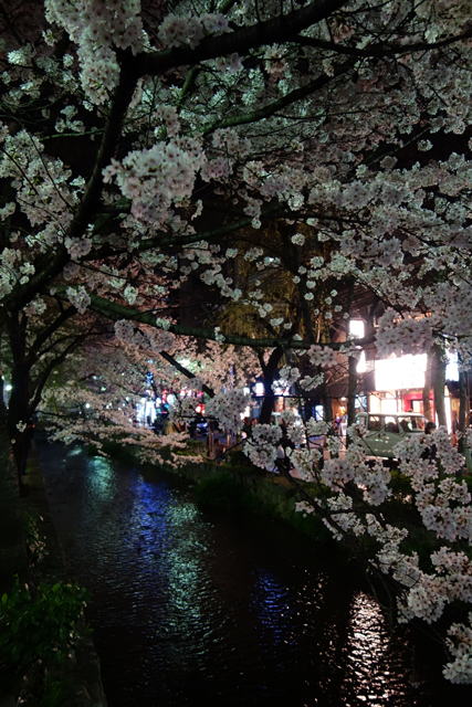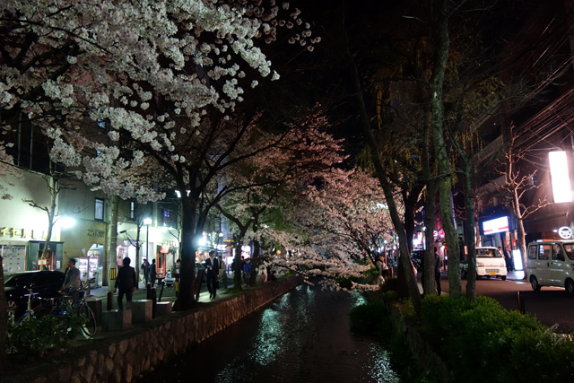 走到了與「四条通」的交會口,車水馬龍的主道提醒我回返現實,提醒我看看手錶,讓逼近十的短針促我踏上歸途,儘管那漫盛的櫻景似還隨著「高瀨川」的低聲涓流,一路往南,不知會在街巷與商家、與民宅勾炫出怎樣風情。我在路口徘徊,作最後的佇望,橋畔的櫻樹巧笑倩兮,宛若攏起髮髻、插上簪櫻,正欲參加祭典的清麗女子。華美的和服裙袖揚擺,彷彿下一瞬便會化作舞蝶,隨長川迤邐而去。