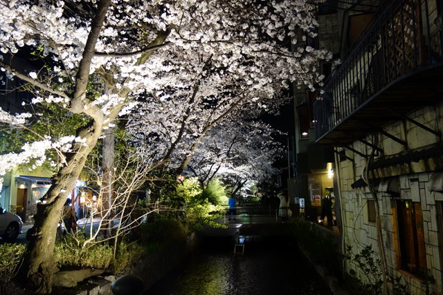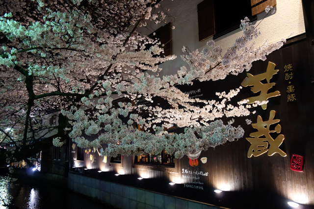 摸著被撐得圓鼓的肚腹,我心情輕快地踏出店門,往北挑處巷道往旁切轉,不旋踵便看到「高瀨川」潺流於「木屋町通」旁,而著名的河櫻麗景也霎時列展而現。街道被這麼命名,感覺該是放眼之處木屋連綿,不過其實是「高瀨川」航運帶起各行商業,衍生出「米屋町」、「紙屋町」這樣的區域,而「木屋町」聚集的自是販售木材之類的店家。然現時看去卻無法覓得這樣類型的招牌,餐廳大肆漫入,傳統矮屋也早化為雜錯公寓了。