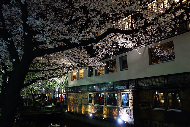 一路這麼緩步停望,不由自主想起昨夜的「白川」夜櫻。很難分出軒輊,「白川」那兒的伴綴古老町屋,散揚的是種懷古幽靜,這裡的融生於鬧區,柔化新式樓閣的硬冷,讓緊張枯燥的生活添加紓緩情趣。似乎當隨便瞥望一家咖啡廳,打了光的巧思壁板設計都顯多餘,勾圍成框的櫻枝便自然誘人循畫而入。有點失修的斑駁公寓與雜沓遊眾也都被絢爛的華瓣光影逼得黯淡,不嫌污擾街景了。