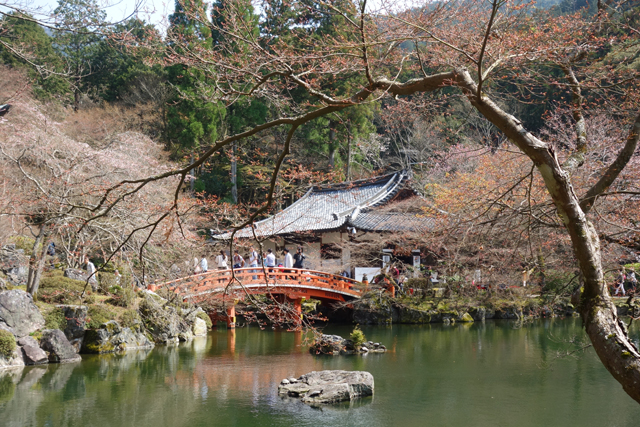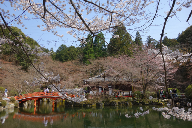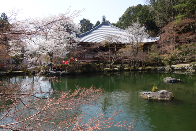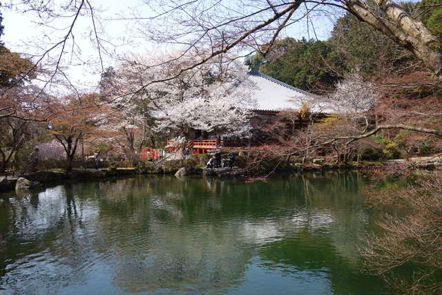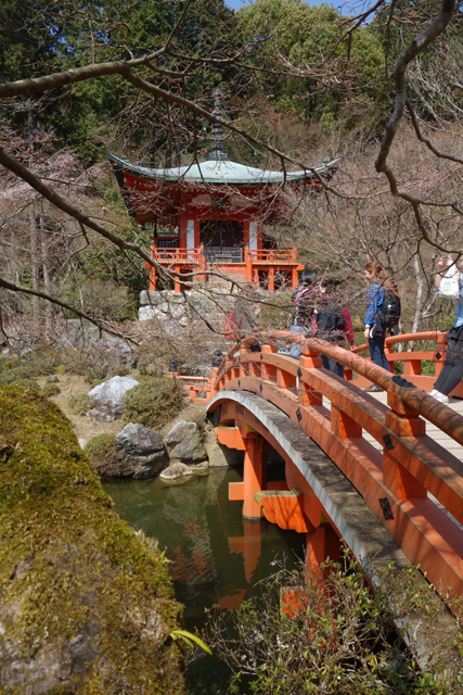 「觀音堂」的出口在另外一側,但才踏至緣廊,堂外之景便令人眼睛一亮,很令人意外地,這「下醍醐」邊境竟拓了一池,雪淨層疊櫻瓣與青碧起伏丘巒堆抹成繽紛幻彩,將池水抱擁在懷。我在岸旁立望,搖曳池光中,朱紅短橋以微彎拱姿搭上假山,然後騰躍化形為小巧的「弁天堂」。堂體結構簡約,疊石立欄、方堂轉飛翹簷尾,但藉挑立相輪勾出的展翼形姿卻如凰現降於林,庭池之景也因而鮮活起來。