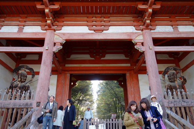 這燦景同樣也豐潤了「仁王門」色彩,掩映櫻枝後朱紅門樓高聳壯偉,揚展簷架下金剛力士法相威嚴。我趨前細望,兩尊力士依嘴部開合分為「阿」形與「吽」形,深沉木色雖被歲月潑染上斑痕,卻不掩其怒顏威凜,他們挑眉瞪目,望進世人心底,逐去貪癡怨戾。