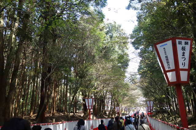 穿過「仁王門」,兩旁林樹參天,帶著桐徽的紅白隔簾一路拉展,與間隔豎立的多角燈籠營造花季的賞遊慶趣。雖少了方才兩熱門院落繁盛似錦的櫻花,倒也一轉視覺印象,讓沉碧清幽的林色伴人前行。而此區既稱「伽藍」,自是以各塔閣拜堂為主,就某種層面來說,重要性更凌駕前兩院,只是這季節遊人來「醍醐寺」多為著櫻花並非禮佛,自然一路的行眾也減少許多了。但儘管無櫻樹密集叢生,亦非乏善可陳,當循徑前拐,走入散立建物的廣場,依舊能見幾株伴點粉色。