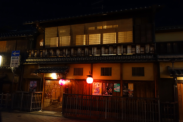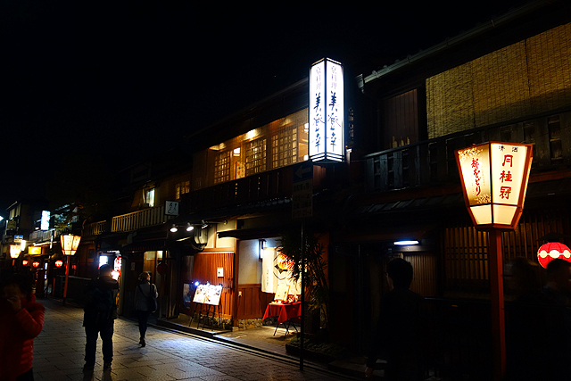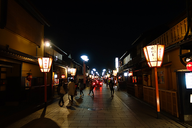 第一天就搜刮了眾多戰利品很讓我心虛,但往歸途走的腳步卻是滿意又輕快。起初是朝已燈影燦亮的「八坂神社」尋著公車站,不過發現附近岔路標著「花見小路」又勾使我往南探。印象裡,入夜前走過的北段充斥著近代樓房,如一般都市般讓人感到索然乏味,而此處的南段,儘管像為了觀光刻意復原新修,但町家矮屋的成列蔓生,便是夜裡的一種幽然景緻。