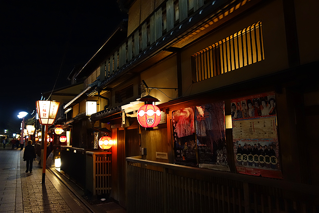 宛若為拼築出懷舊氛圍的石板路略嫌工整,但兩旁朱燈光暈勾現的微明屋形依舊婉約,沒有腐靡笙歌之樂,亦無食客鬧酒擾嚷。墨簷下竹簾篩出定靜光柵,矮籬後框門張成一隅亮景,那兒櫻瓣竹枝掩映,紅布方几托呈幾品艷趣和果子。而海報上藝伎衣衫飄魅、顧盼生姿,彷彿我一閃神,她便將走出畫裡,攜著袍袖間的飛花舞蝶,循整路的搖曳燈火沒入夜巷。