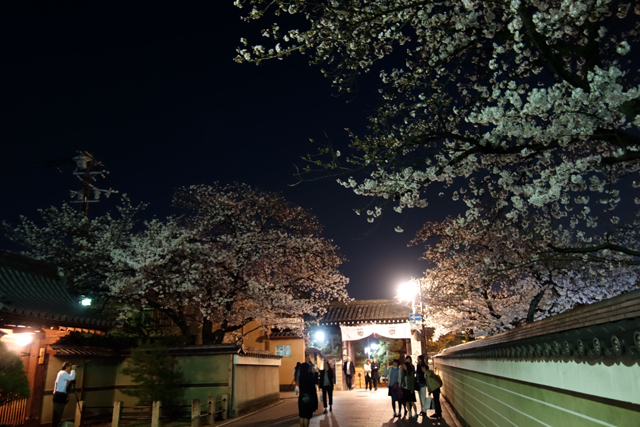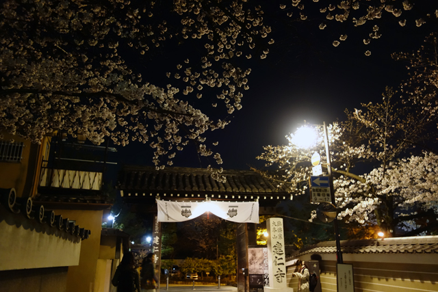 踏著炫惑燈影我一路往前,漸漸地商家疏渺,替成些深宅民屋,連綿的墨簷也化為探出圍牆的櫻枝,在偶爾支起的街燈映照下,碎綻出粉白交織的淡雅花幕。盡頭,一方寺門將長路迫轉了向,石碑上刻鑿著「建仁寺」,令我不禁猶豫該拐彎赴往主街的公車站點,還是繼續這隨意之所至的遊訪。但或許初到京都的新奇讓興緻過剩,一轉念,我仍舊隨著幾個散客步入寺門。