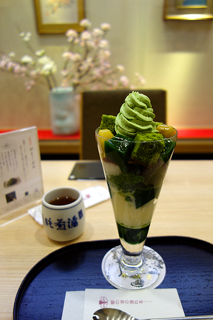 於是我的目光在各商品間擺盪,櫻花聖代因有「期間限定」的魔力加了幾分,但根據經驗,它儘管造型粉嫩如花綻,卻可能僅是香草口味再添點莫名甜膩。焙茶為主的類烏龍茶醇厚一向深得我心,但京都標榜的抹茶又令我無法割捨。當中自然還有些微配料差異的組合在搗亂,結果最終還是一咬牙押注在眾多先行者的經驗,選擇此店招牌「特選都路里聖代」。