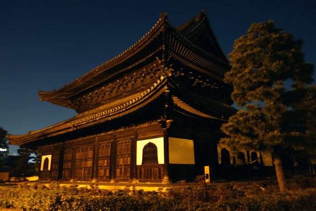 這是未規劃於旅行藍圖之點,故所知的,也僅是其為京都最古禪寺,並藏有姿態靈動之「風神雷神」立屏,及浮懸於天頂的壯闊「雙龍圖」。而此時入了深夜,這些國寶自也隱於深院,或許便是在錯身的本坊法堂,與我一牆相隔。但這錯過也無礙眼前夜色,寺牆繞圍出一片靜謐寧地,腳步沙響與風拂葉聲成了其間的禪語呢喃,細細碎碎熨貼過心房。