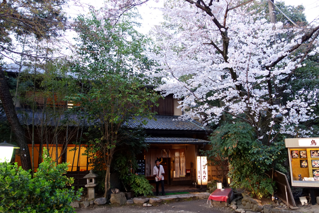 不想走與來時相同的神社步道,便循外環的坡路盤折而下,這兒路邊似皆是些餐廳,以低矮的日式房舍、古陳的竹籬墨瓦,持存舊時代的食藝與用餐氛圍。然或許遊人還貪戀黃昏微光的花影,或仍沉溺「八坂神社」聚起的歡鬧,這參道清冷,僅偶能見得店員於門前笑臉鞠躬問禮,但卻切合我喜歡闃靜的性子,讓我得以踏著古樸幽色走回「祇園」街區。