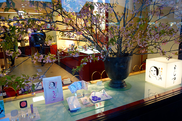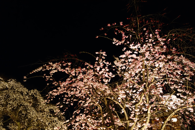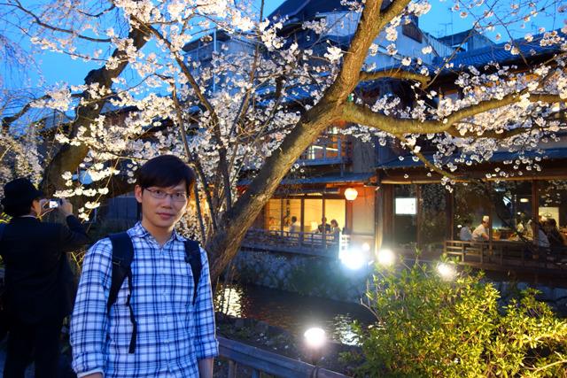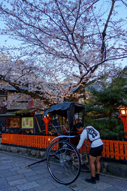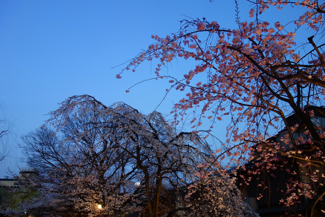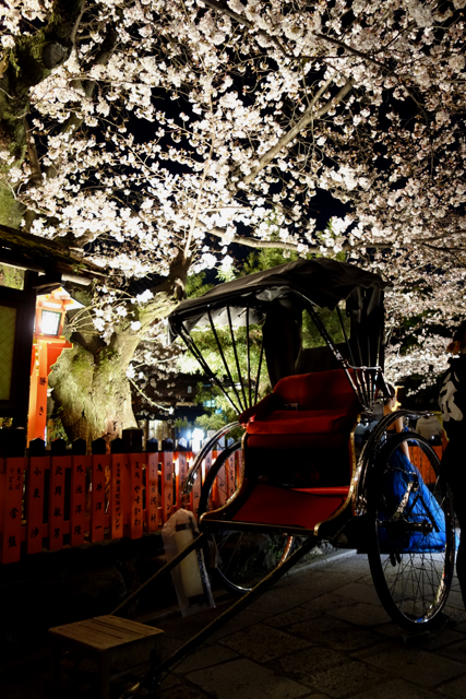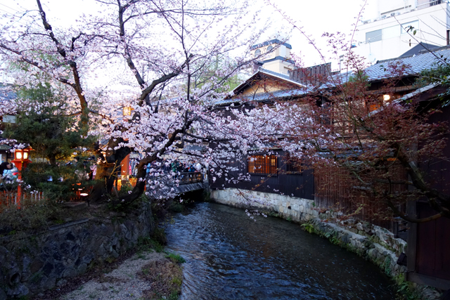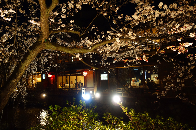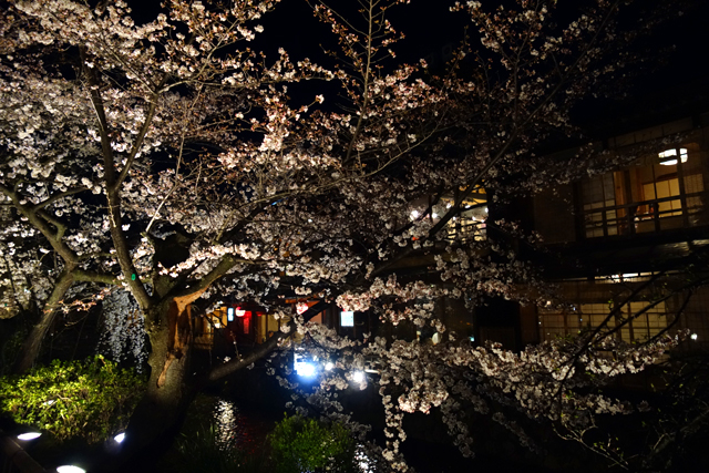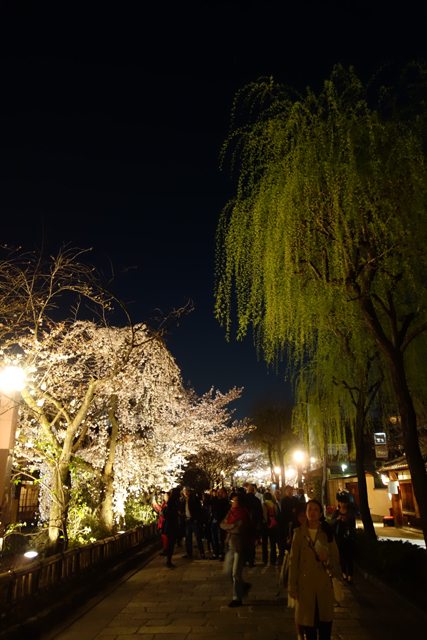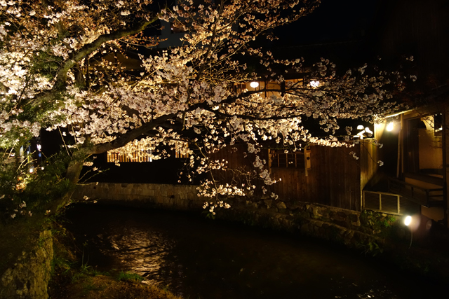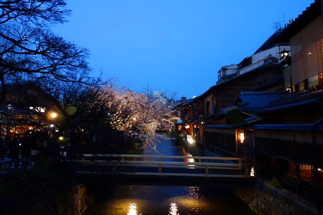 我在這片小廣場逗留了好一陣,才又循原路依川往回走。方才來時天空還有些微藍,這會兒已是深沉,打光的櫻花被映得更為炫亮,呈現不同氣氛的景緻,雖因而無法將細部輪廓拍得清晰,但也以光影的聚散勾人定目。橋欄、燈座、人力車,我四處望著,有時幾綹高懸柳絲在這片亮白間青碧得可人,有時河畔窗內的用餐男女化為畫框中景物,點上幾筆閒趣,而當行至「巽橋」,竟讓我瞥見某間屋閣的廳裡,一位藝伎正舞轉著身姿。