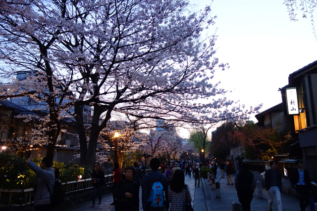 親眼見到藝伎令人心情興奮,不過不遠處其實還有條「花見小路」是必遊景點,它與「四条通」垂直交叉,沿路餐廳不少都設有藝伎表演,故而若肯花點時間守候巡獵,也定能發現她們前去工作的芳蹤。不過當由此轉往北,卻再沒讓我瞧見啥惹眼目標了,可能為躲避觀光客的干擾,多半都轉往方才那樣的窄弄藏影匿行。也罷,反正既有收穫便不在乎多寡,況且今晚目標是不遠處的「白川夜櫻」呢。