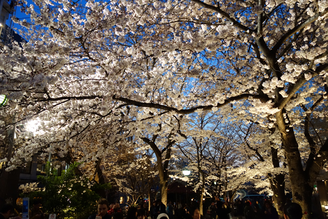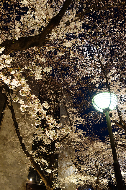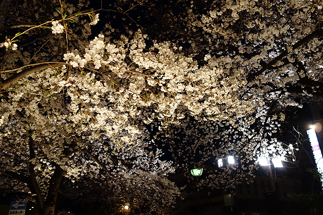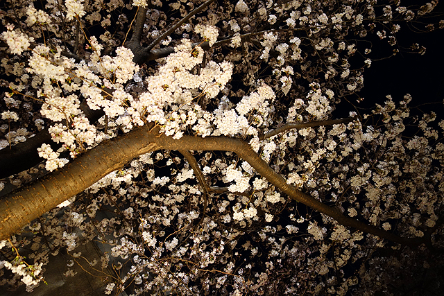本以為櫻花之盛便是這樣了,但當過了條繁急馬路,在「白川」接入「鴨川」的末處,空地卻被數列櫻樹的花瓣織密了天頂,像是爍亮的星點,因打光而炫惑成銀河,也似隆冬之飛雪,飄亂於寶藍夜空。