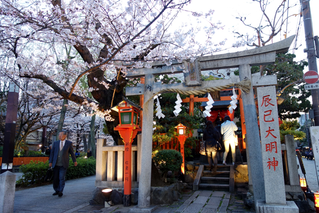 原來,「白川」雖從東一路折拐橫過,再往北走的確會與之相遇,但最著名的「巽橋」區段卻是在這兒,可謂誤打誤撞。我穿進人群,走上與小溪相依的「白川南通」,它與「新橋通」的分叉口有座小神社,鳥居刻著「辰已大明神」,該是此處敬祭的神明,而櫻枝橫生拂過,展出粉白花幕,與朱紅燈座交織一片絢麗。