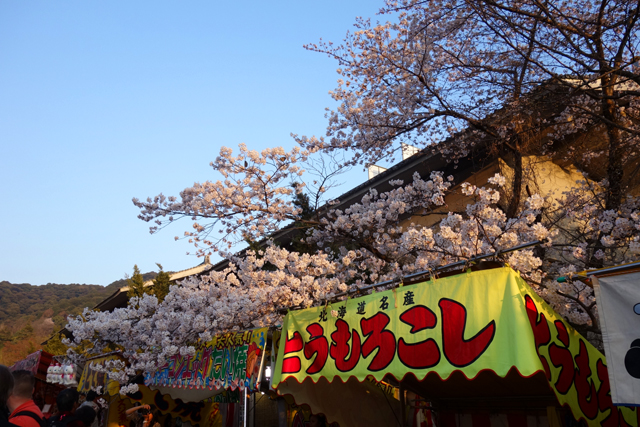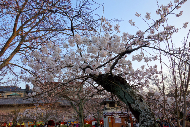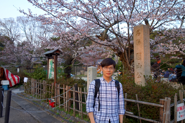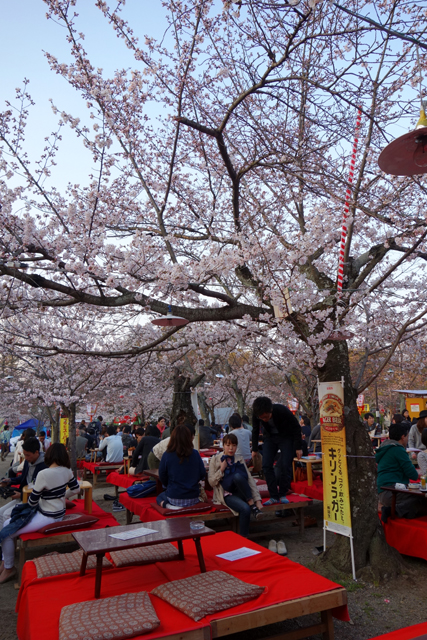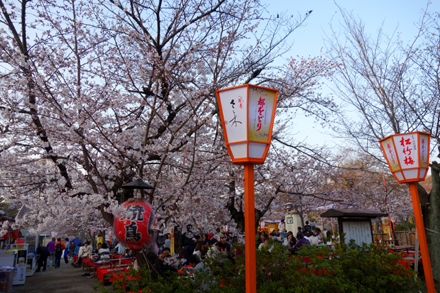 行道通抵的是「円山公園」,神社內遊人拜眾穿遊,此處也不遑多讓,徑路兩側蔓延無數攤販,以各樣燒烤串物藉溫煙遞送辛香。故放眼所見不論老幼男女皆拎著丸串肉捲,一邊闊步閒聊,一邊滿足口腹之慾。而雖說攤販羅列頗似廟會夜市,卻無煩雜之感,棚簷掛布之上櫻枝探首,風雅了五色炫亂的店招文字,步徑兩旁紅艷燈籠幾盞,古樸了擾攘遊人之現代衣著。當再往裡處去,徑間空地便是紛呈櫻樹,以粉瓣密織成傘,拂蔭著賞花人眾,他們或棲坐於紅布木椅,或圍聚在草蓆之上,笑語交錯,享受被櫻花引領而漾的初春氣氛。