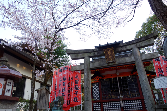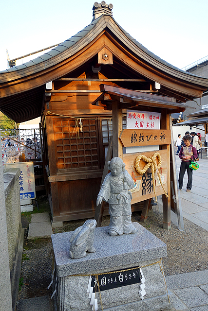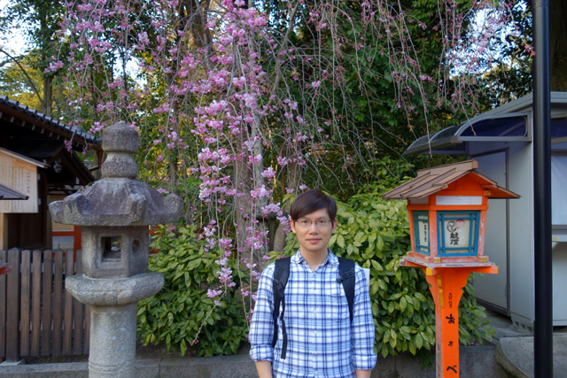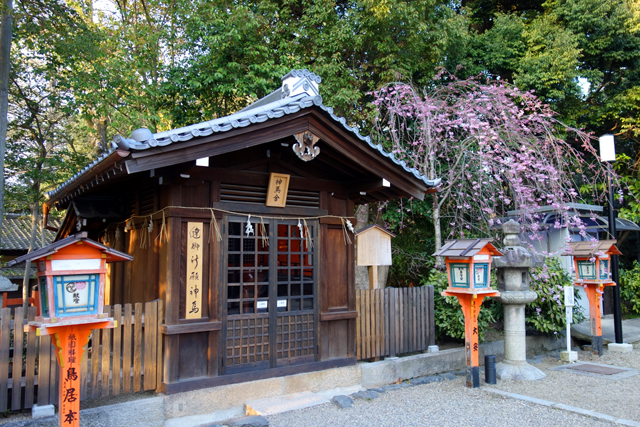 不過神社外在門面掩去了內裡敬祭之物,竹簾、木窗,層層疊疊讓人看不清殿內雕琢,也無法得知是否有著神像形塑著「素染鳴尊」身樣。能做的只是閒看人們閉眼合掌、唇齒微動傳訴著祈願,甚或是笑望孩童胡鬧扯搖著鈴,然後隨意繞著各個屋舍逛行。然京都雖櫻樹紛植,此處卻不見鋪天蓋地的粉色,僅清清雅雅幾株枝瓣掛垂,所以便花不了多少佇賞時光,繞社一周,揀幾個角度央人幫我留個影,就順著東側行道步出。