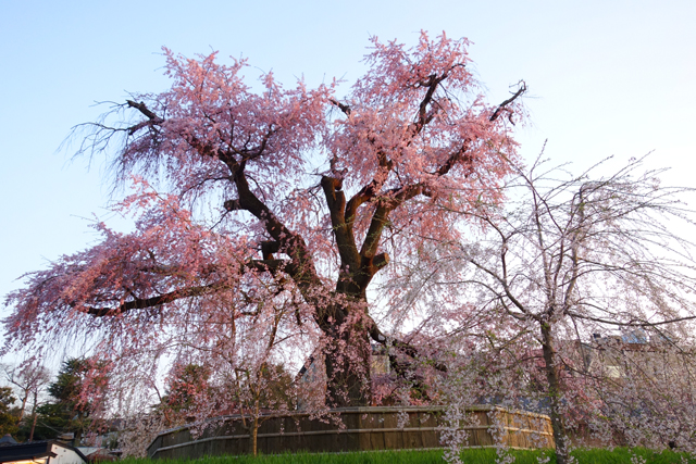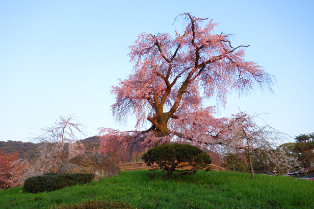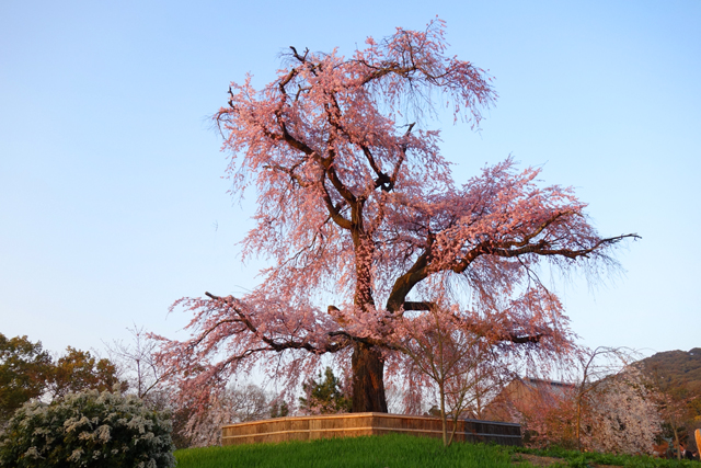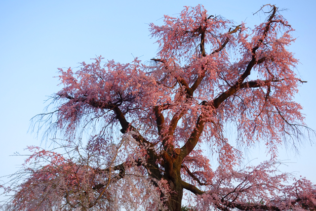 台灣這些年瘋迷櫻花,從冬末便能見又稱「山櫻花」的「緋寒櫻」以桃紅之姿繽紛山間,進了初春則轉為「吉野櫻」的主場,用淡淺粉色柔媚民眾心頭。但儘管這當中各樣變種衍生,卻始終未見在日遊照片裡令我驚艷的「枝垂櫻」,彷彿因著氣候,硬是與我們土地絕緣。而當穿過「円山公園」裡依樹食飲的層群人眾,我終在園心小丘望見了它,它孤高拔地而起,一路歧生著枝幹,而如垂柳般的細枒則如瀑灑落,奔瀉粉雅碎流。這就是此地女王「八重紅枝垂櫻」了,重瓣種的枝垂櫻讓花景更為豐潤,也更令人怔望。