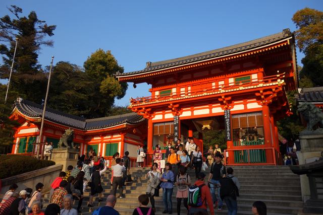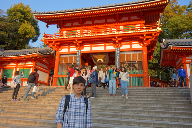 不想第一日便傾家蕩產的我,刻意忽略櫥窗內的五光十色,收攝心神往十字街口對處望,那兒是「八坂神社」西樓門,朱紅柱樑將樓面勾拉成框,於夕陽映照下顯得燦艷,頂著墨簷的門樓則高踞而起,在階頂形成醒目焦點。