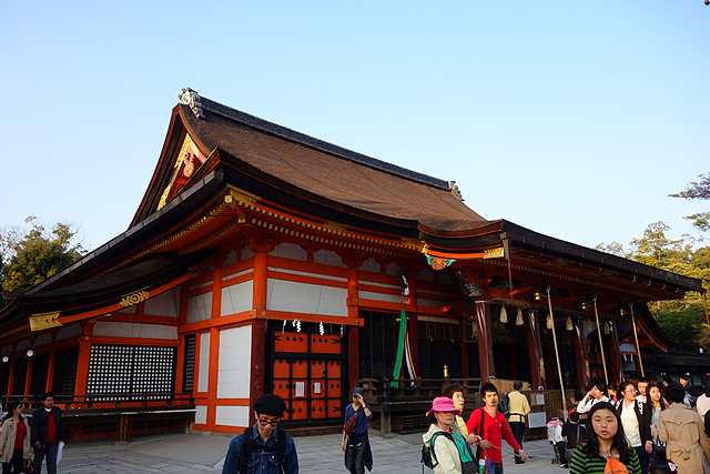 西邊南邊兩個主參道的交會點是「舞殿」,很可惜地正與南樓門一同進行屋頂整修,看不清面目,好在本殿沒受牽連,大斜簷翻挑著浪尾,綴金朱紅框架交劃著淨壁,殿口便是幾道垂掛鈴索,供遊人拜眾牽搖、擊掌、祈唸心願。