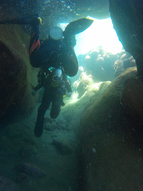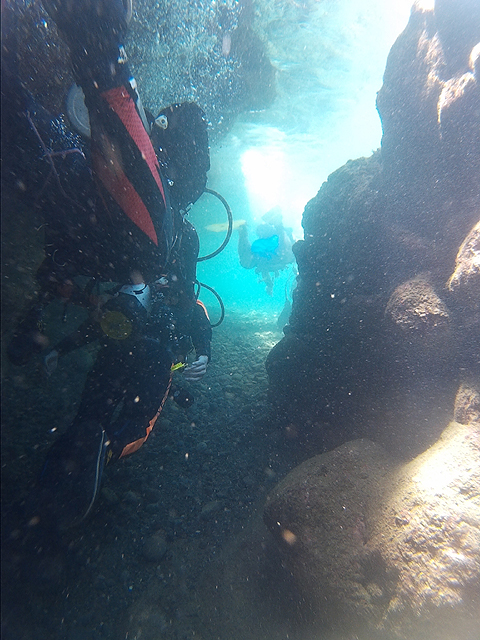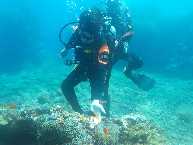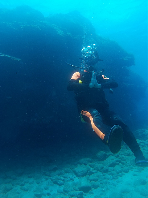然後一面下潛一面運用下水前教的技巧,捏鼻鼓氣平衡壓力,壓蛙鏡上端吐氣排掉滲進的水,