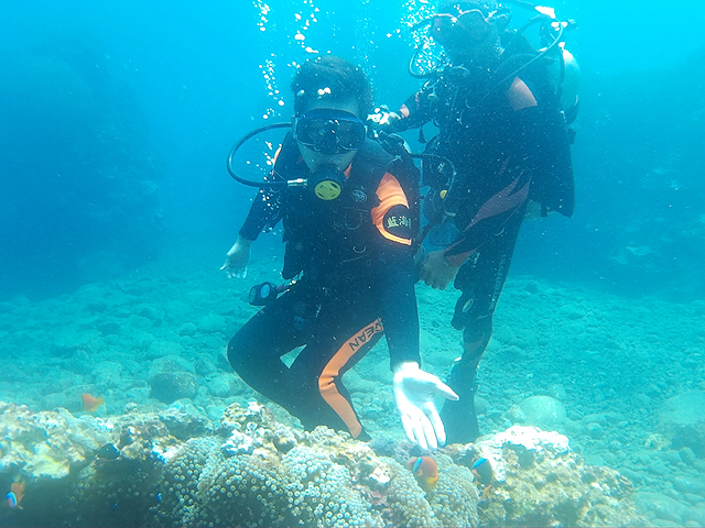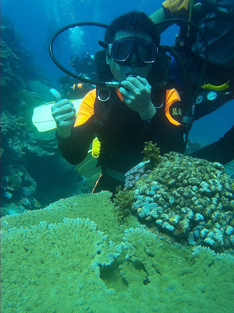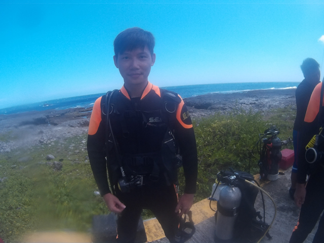 在教練們的幫忙下,我們背起裝滿管線的救生衣跟氧氣筒,