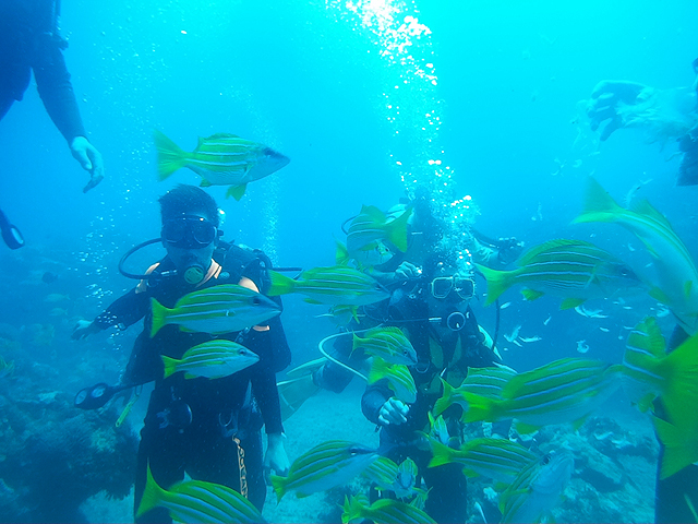 (腰間還掛滿鉛塊之類的,超重的,都不怕我們浮不起來嗎…..)