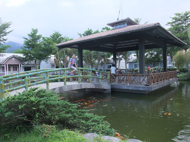 木屋群中間有涼亭小橋水池,半夜肚子餓可以出來摸黑抓魚吃。