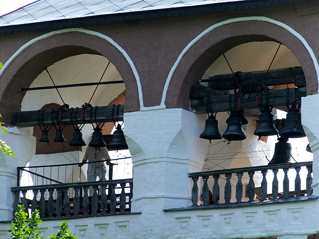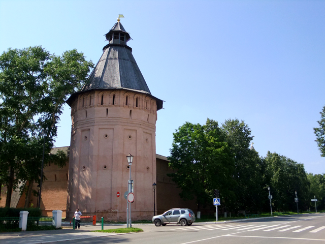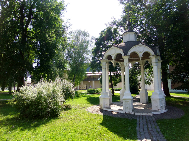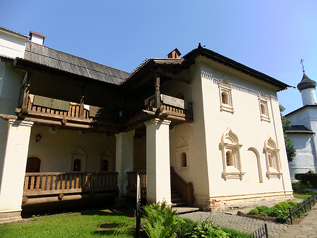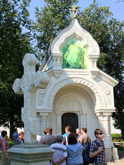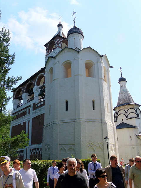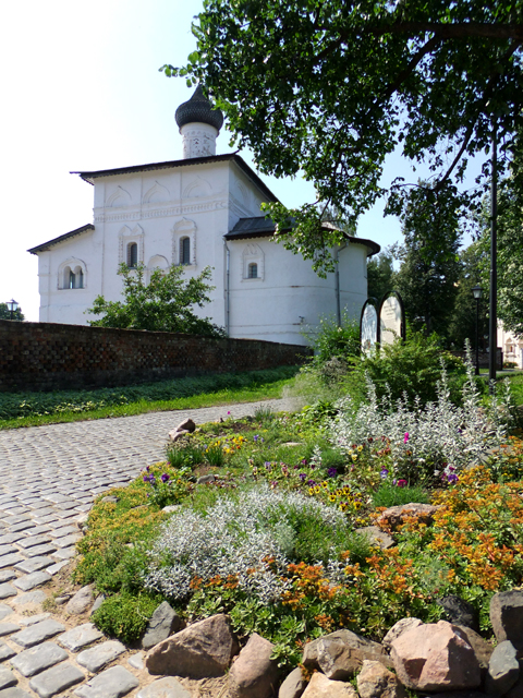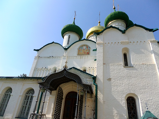 轉過鐘樓,果然另有景致,一邊是串連餐廳的「聖母升天教堂」,正迎面因容納祭壇成半圓弧壁,簷上為瓣緣攀塔疊附,將錐頂帽冠飾得瑰麗。再往裡看,為此院最主要的「主顯聖容大教堂」(Transfiguration Cathedral),前身建於十四世紀,與修道院一同砌立。當時的首任院長便是「聖艾爾菲米」(St. Euthymius),他以清苦修行自持,追隨者眾,去世後埋骨此堂。然之後與喀山汗國的戰爭及十六世紀的大火摧毀院裡諸多建築,故眼前堂廳為重建之物,敬奉著於廢墟找出的「聖艾爾菲米」遺身。