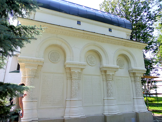 十七世紀擊敗波蘭入侵的英雄「德米特里‧波扎爾斯基」祖先來自蘇茲達爾,故他也埋骨於此,鐘樓北側能見十字架墓地與紀念禮拜堂。禮拜堂曾於近代復修,因而顯得淨潔,白皙小堂滿佈紋刻,相當精緻。雕柱拼併撐起弧拱,花串成帶形成綴邊,銅門上刻鑿的應是他與夥伴「庫茲馬‧米寧」之英姿,簷脊則挑高而起,流曲如焰舌。往堂側繞,壁面還另細刻著文傳,推測為其生平事記。