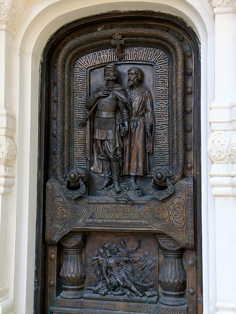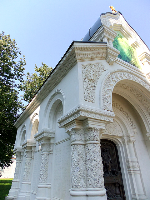 教堂外觀傳統,為方堂支著五塔,然周邊四塔冠帽碧綠,與這幾日所見之非金即銀略有不同,牆面沒多少刻鑿,簡樸一如修道院清苦生活。堂前另添了矮門廳與單塔副堂,打亂了原本對稱架構,門廊細柱拱頂勾花,是較有妝點之處,見有遊客推門而入,我便大著膽子跟了進去。