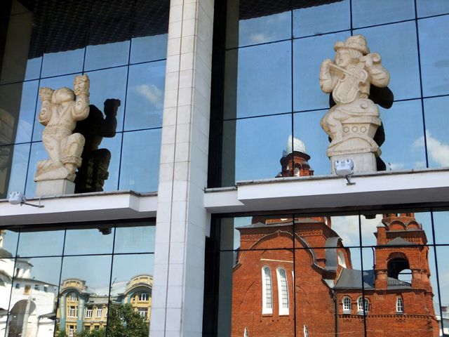 停車場周邊另有棟磚色建築,色澤望來嶄新,形貌也雅緻。弧簷挑勾,外綴節柱露臺,而後雙塔以疊瓣簇擁堆砌,一高一低銀炫著正午烈陽。它是二十世紀初搭築的「聖三一教堂」,不過據說目前也成了博物館,展示些工藝品。與它相望的長樓風格反差甚大,平簷下方整列柱、玻璃牆帷,是個現代簡練結構,作為當地的藝術中心。儘管這樣線條不討我歡心,然鏡面綴著一個個憨態可掬人偶,歪首揚琴,倒也有趣,襯著教堂切弧綴連鏡影、廣場繽紛爭妍花簇,另有風味。