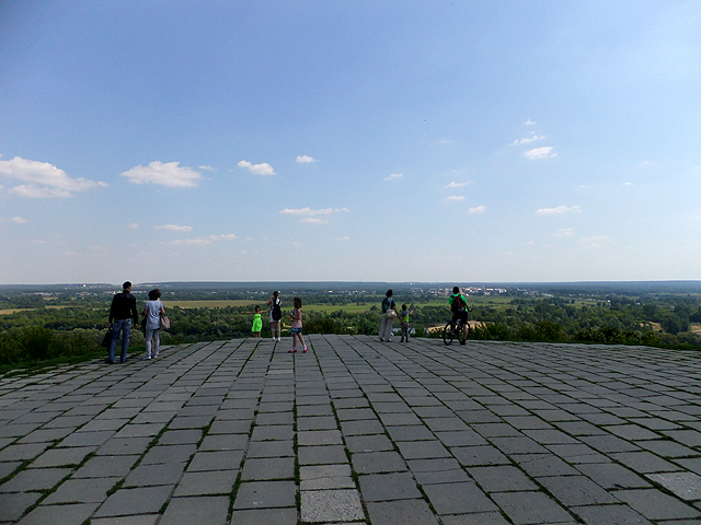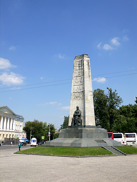 下了車,先望見一根紀念柱,三面凹弧,字刻雕畫夾雜,底座各嵌置一尊坐像,這紀念建城八百五十週年的石碑是上世紀所立,光數字便令人肅然起敬。當時沒多少時間分析雕刻,但其實三個坐像分別代表建築師、工人及戰士,並有其對應涵意。令我分心的理由自是旁側之景,碧毯小坡上教堂巍立,勾出一隅眾塔穿雲。