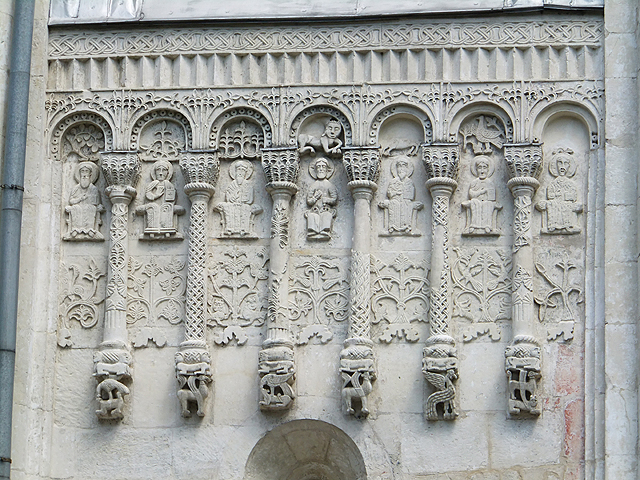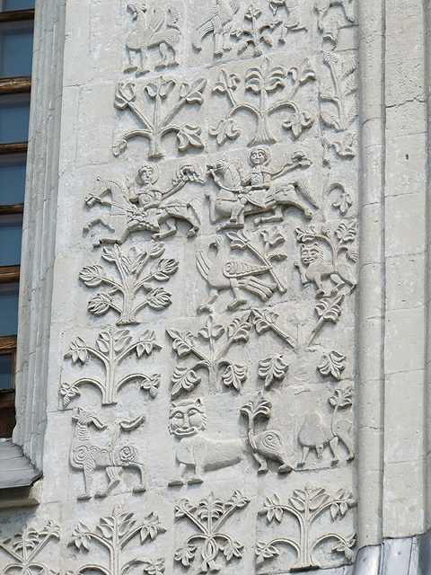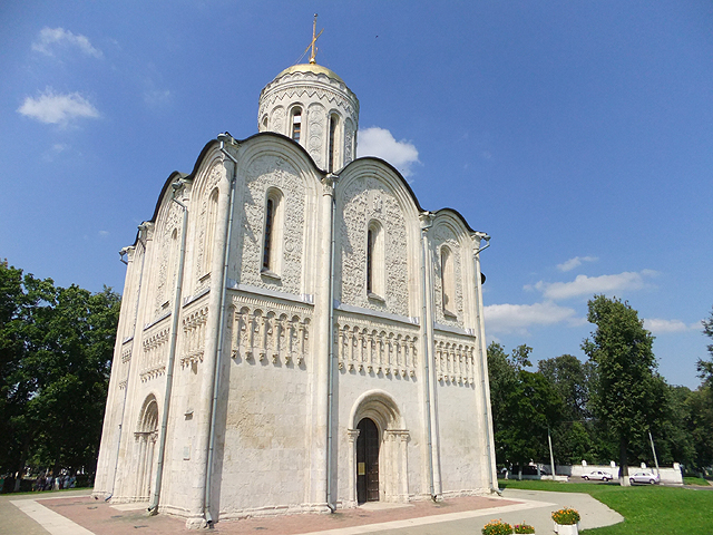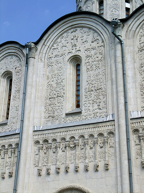同列世界文化遺產的建築還有另一座,從丘旁長樓循林蔭步道前行,便可見其孤單屹立。這間「聖迪米提教堂」(The Cathedral of Saint Demetrius)也有相似結構色調,長狹窗、波弧簷,但為單塔獨立。別緻的是其壁面紋刻,細細密密,如素白隱紋錦緞披展。趨前近觀,每個拼石塊面都是生動奇獸,帶點神話似的奇詭造型,不過卻因身臉比例而多了些童趣。除此之外,垂懸飾柱也精妙,花葉疊綴、鳥獸收尾,拱框內還雕列貴族樣貌的小人偶,晃頭擺腦,令人莞爾。
