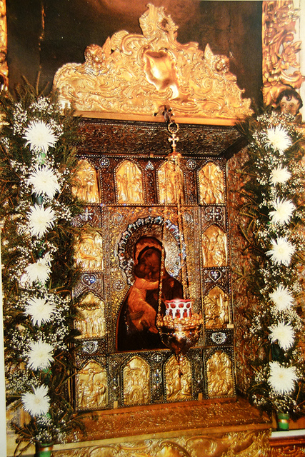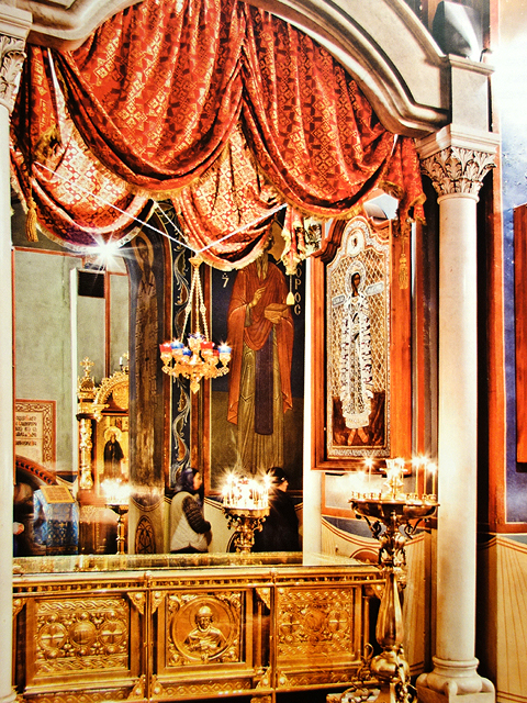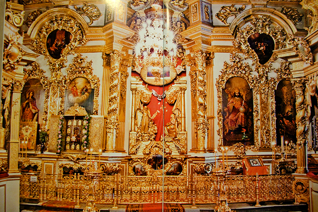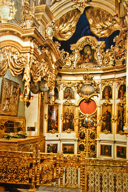 既然印象淡薄,也不好隨意瞎扯,然倒很有可能牆柱上就是傳統聖像壁繪堆疊,才讓它與其餘教堂模糊了差別。但聖像屏有簡冊圖片佐證,便值得一書。最早的原品並無存留,目前擺置的是十八世紀重新設計之物,也因此滿溢洛可可風格華裝,極度撩目。鍍金拱弧、飾帶、旋柱之間,是勾繞得繁複的藤葉鑲邊,擺脫古老的方畫橫直堆架,轉為曲框交互嵌襯。若往左手邊瞧,能見此堂最珍貴的聖母子像,儘管早期版本被收於莫斯科的博物館,但眼前再製之物仍被精緻龕箱敬護,團繞燦紋。