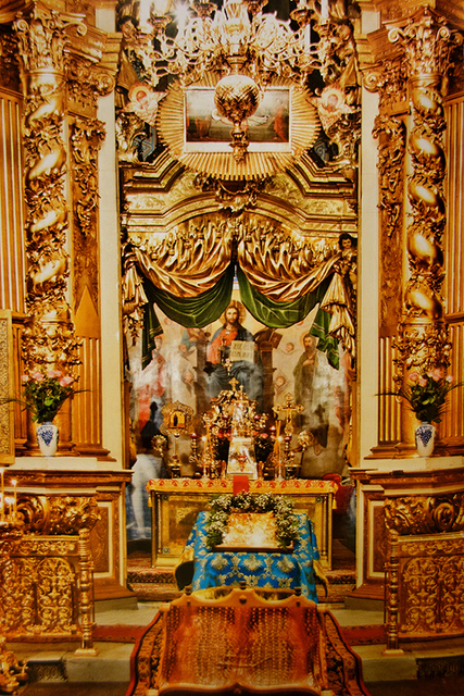 除了構圖飽滿豐富的彩繪,聖門亦有獨特設計,柱座旁倚,垂簾弧欄,揚臂天使與坐望聖母於兩邊合構為聖母領報之景。這樣絢麗的雕鑿同樣出現在側翼副屏,捲框擺葉鑲畫,炫亮簾帳環頂,各樣華蓋之下能見祭著舊時主教聖物的棺槨。過多的視覺衝擊讓人短時間難以吸收,似也因著如此緣由,我才會在行出教堂後,腦海只存滿室竄繞的光影,而無法細述。