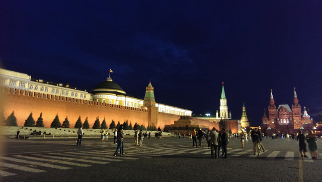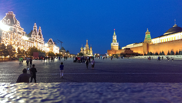 儘管時間已過夜晚十點,眼前依舊如白晝般人潮如織,居然還有遊客尚攜行李無數,便跟著領隊旗幟闖進,彷彿才剛飛抵莫斯科,就忍不住趕來一睹廣場夜景。燈火光熾如炬,似乎連墨空都因此透了點深靛之色,當一反身,末陽落降處還能見些飄漫雲靄,在寶藍天穹舞著,而博物館的赭紅磚身,襯著被光照炫亮的刻紋,成了支槍立嶺的夜之王者,以魅眼幽望。