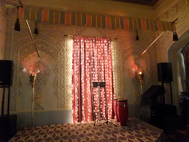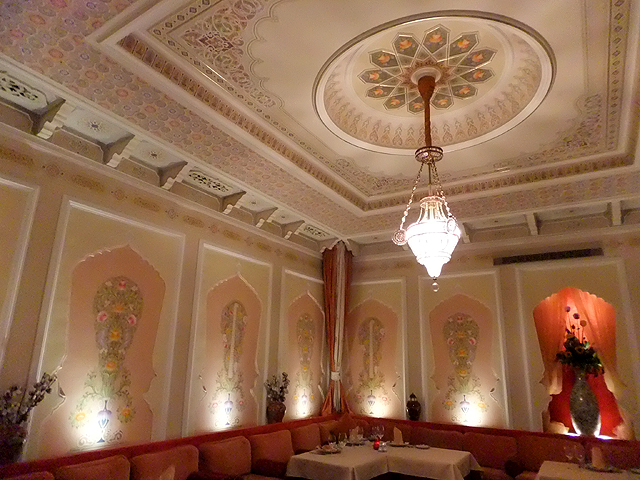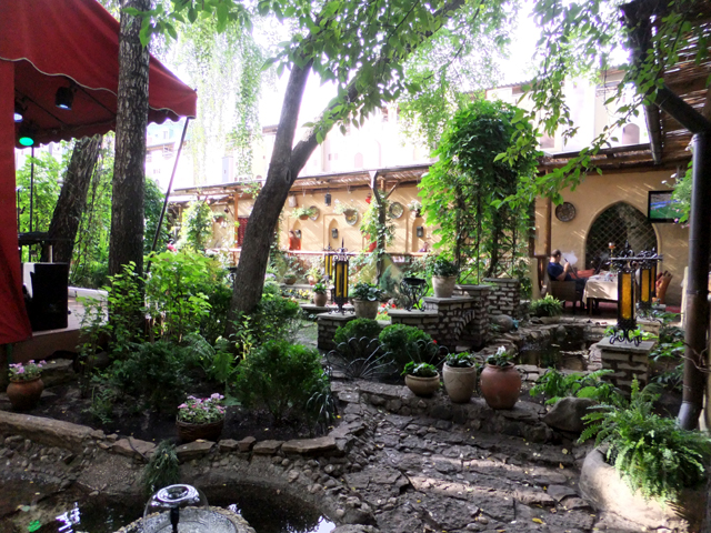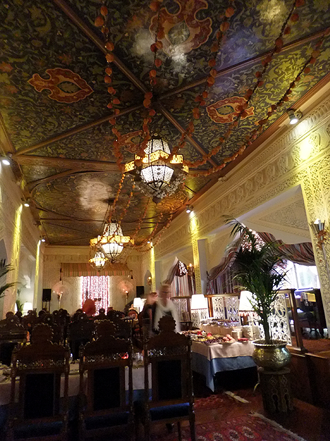 遊晃之後,隊伍終於三三兩兩再次集合。中午在金炫貴氣的「杜蘭朵餐廳」領受了視覺饗宴,晚餐也屬特別安排,為有著烏茲別克風格的佳餚。白色外牆上馬賽克拼花橘藍相間,帶了點回教的裝飾元素。推門而入,遍滿圖騰的彩頂垂掛珠綴,多角燈籠細櫺交錯,灑落溫黃柔光,將廳室暈染得幽幻。細碎雕鏤的牆柱也切出伊斯蘭式的弧角,在某些廳台重點處挑勾為折曲內緣。探頭望了望隔壁包廂,類似風格的雕琢重新拼組,又成了氣象迥異的粉嫩空間。而當從內門廊往中庭窺看,林樹垂枝繞池,蓊蓊鬱鬱,似乎閒坐於綠蔭下,亦有另種慵懶獨飲氛圍。