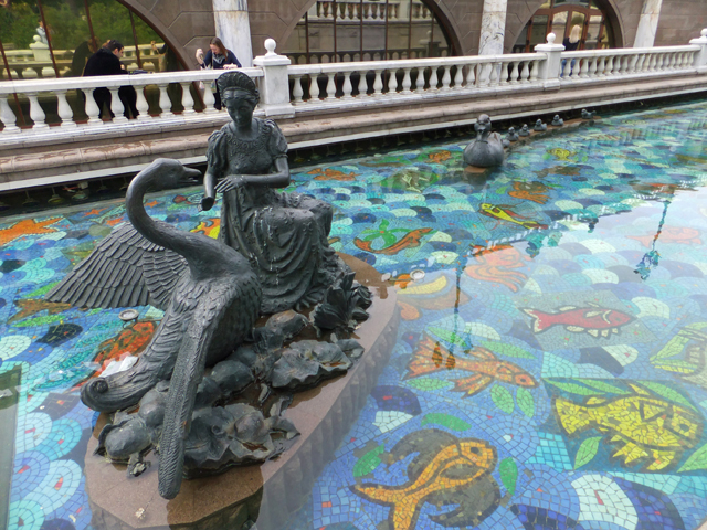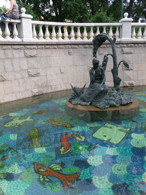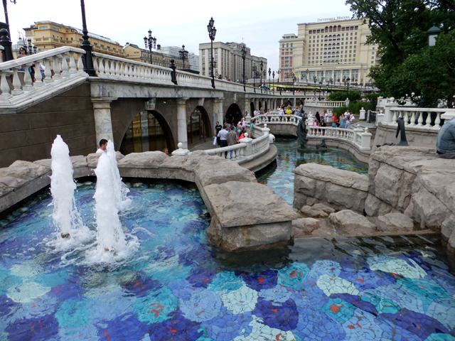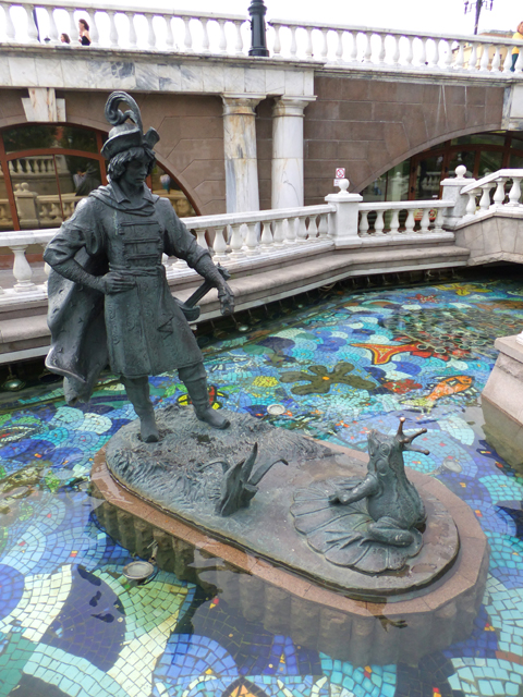泉池往前是人工水道造景,仿擬被埋在地底的「涅格林納亞地下河」,河道以不同彩度的青藍碎磚鋪漫、游魚拼綴,讓水色顯得清新活潑。我順著圍欄彎拐上下,賞著其間妝點的雕像,它們依俄國耳熟能詳的童話形塑,各具趣緻模樣。能見狐鶴相視、打著交道,狼熊對峙、爭執魚糧。有華裝王子藐指戴冠青蛙,宛如上演「青蛙公主」戲碼,亦有秀雅仕女逗飼天鵝,不知說的是怎樣故事。
