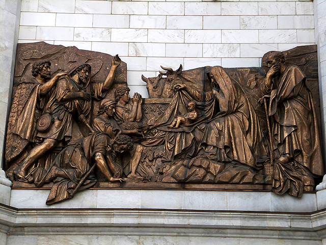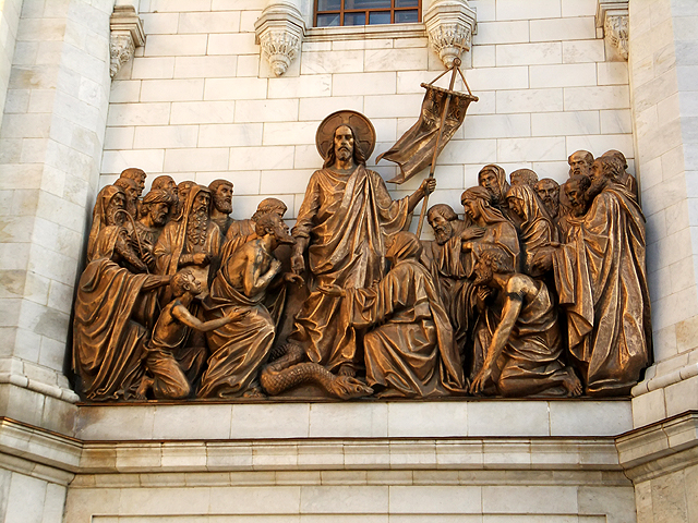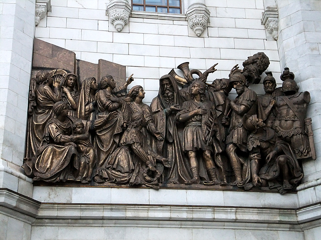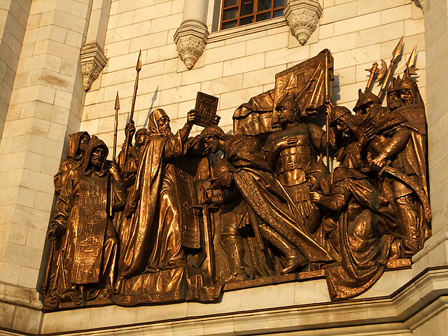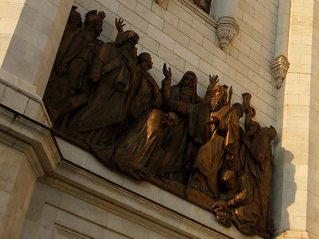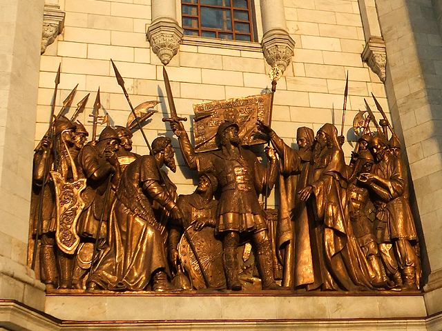 由於教堂建立與戰爭勝利頗有淵源,因此雕作也記述俄國爭戰歷史,有主教在波蘭之役幫英雄「米寧與波扎爾斯基」祝禱,亦有聖像為「德米特里」(Dmitry Donskoy)與韃靼對戰加護。這些作品人物構圖豐富,背景衣紋細膩,肅穆神情散發著沉凝氛圍,令我不時駐留定望。