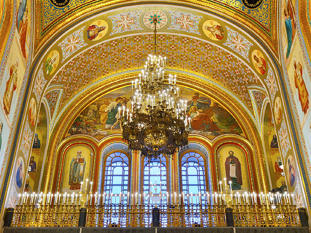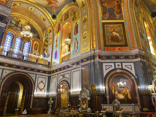 而在這入夜時刻,教堂自已門扉緊閉了。連一旁的小紀念品店都早收攤,無從購些相關物事,但資料圖片裡的堂內裝潢其實彩炫無邊,並非領隊所稱的平凡無奇。十字廳廊以拱弧切劃,白皙壁面先以赭紅石紋提升色度,挑高至弧段時再以金框聖像漫展,艷麗花串勾邊。這些彩畫以近代技法烘托,或在柔暈雲霧中遍灑聖光,或於幽闃廳室內點亮聖容,與「克里姆林宮」教堂古繪相較,有更為流動自然之筆觸。但也不能以此鑑其高下,畢竟那些樸拙色塊承載的,是更為珍貴的歷史步跡,