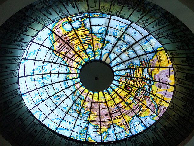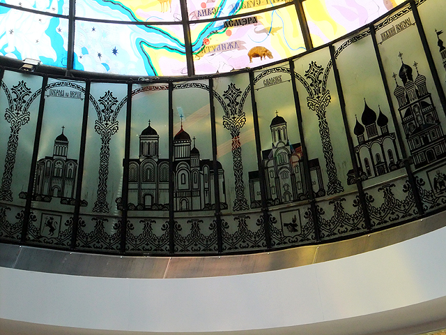 繞上一圈,見還有些時間,便鑽入一旁的「獵人商場」(Okhotny Ryad),這家百貨公司身處「馴馬場廣場」之下,並無顯明外觀,但因緊鄰「克里姆林宮」而人潮不絕。隨興瞥望著速食餐廳、衣飾專櫃,正覺無趣,怎料抬頭一望卻看見奇特物景。原來晨間行過的聖喬治塑像拱頂內面另有機巧設計,從此處仰望,暗淡的地圖紋路在天光照映下如玫瑰花窗綻現了彩度,黃藍相間,通透亮麗。外環還襯飾了形樣各異的東正教教堂勾影,讓人忍不住辨瞧是否有熟悉者。