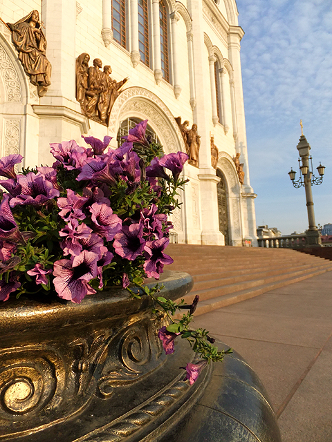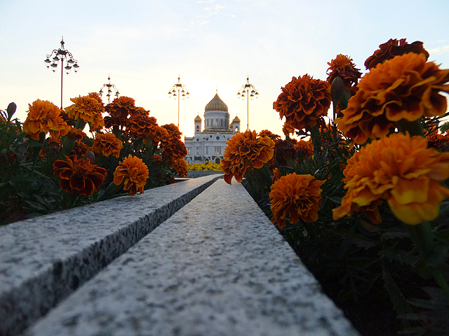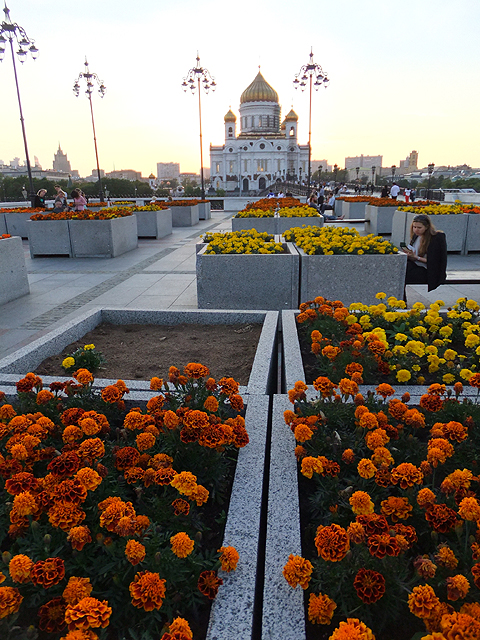 而橋末是個高築小廣場,以橙黃花團點綴,有文青少女乾脆拾了本書,迎著煦風靠椅閒讀。左右無事的我見碎花笑容可掬,便一時興起取了蹲矮角度,將其於鏡頭內拉伸為長列艷林,而花壇緣邊如石道,直抵「救世主大教堂」,於是教堂霎時微渺,縮化成妖精閣殿,在彩瓣間綻著光芒。